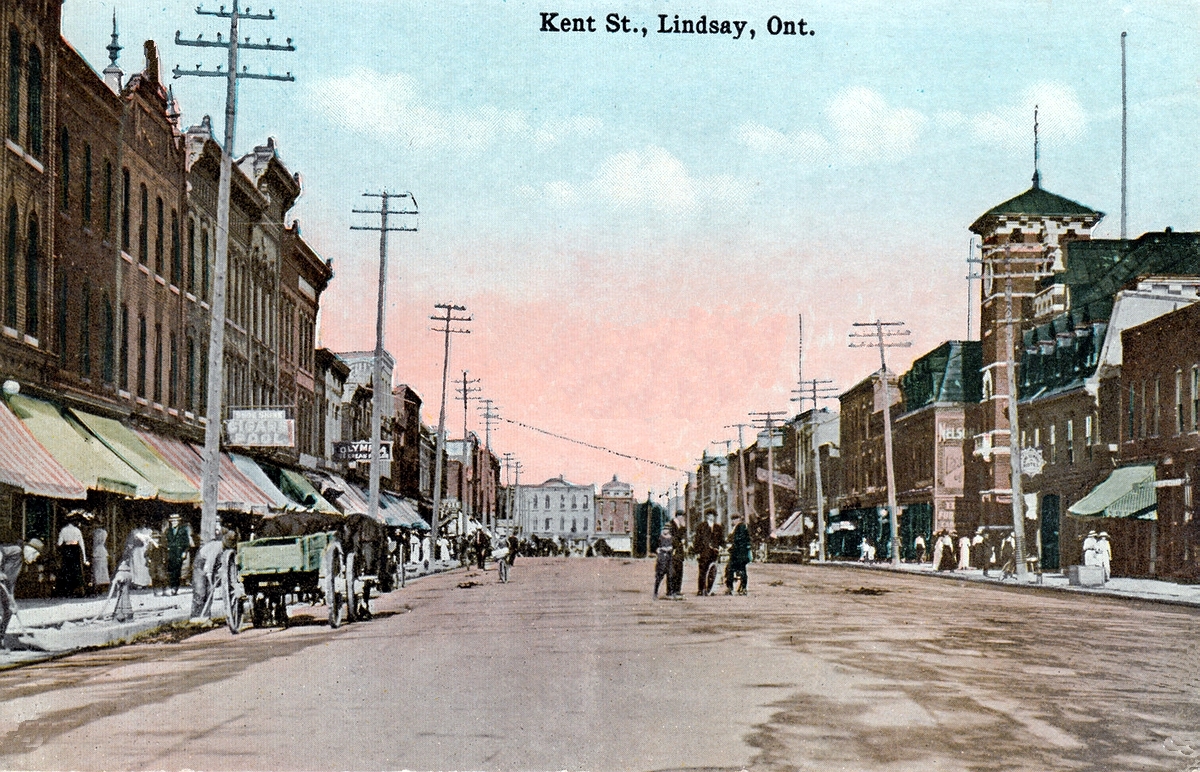 Corner of Kent and William Street Where country crowds dress up so neat And Lindsay ladies make their haul, Clouds, gaiters, gloves and parasol, Plaids, stripes and prints in beauty's mould, Carpets, blankets double fold; Made cloths like pictures on the wall, From London, York and Montreal. To order dress up every class, The master, mistress, lad and lass, Keep groceries and provisions there, Nails, glass and putty, and hardware; Ladies' lovely underclothes, Millinery pink and rose, Bridal wreaths in sweet perfume, And orange blossoms in full bloom.