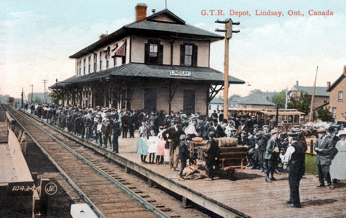 As has been already remarked, the first railway into Lindsay was opened in 1857. It was known as the Port Hope, Lindsay and Beaverton Railway. The station was situated just east of the site of the large grain elevator erected many years later. The railway crossed the river on a swing bridge below the Madison Williams site. In 1874-76, the Victoria Railway was built to Haliburton. Closely following the latter, the Whitby and Port Perry Railway was extended to Lindsay and the station of these two lines was on Victoria avenue about where the G. T. R. freight sheds now stand. Later all the roads were absorbed by the Grand Truck System, the route of the line from the southeast into the town was changed, the railway works were removed from Port Hope to Lindsay and the conditions as they at present exist were established. The Canadian Pacific Railway commenced traffic on the line from Burketon Junction to Bobcaygeon in August 1904.
