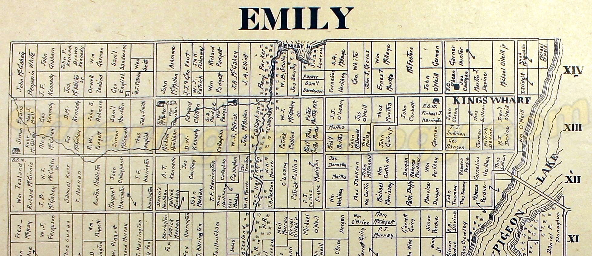 The emigrants landed in Quebec where they were held in quarantine for a time for smallpox, after which they sailed and portaged up the St. Lawrence River to Port Hope. Some remained there, and others who were taking up land proceeded on inland by way of the Trent Valley Canal waters. Some of these people were soldiers who had been given grants of land as a recompense for their services in the past war. Among these were six families of the Millers and Smiths, and from them was derived the name of the community in which they settled Millersmith. There were also the Kennedy, McMullens, Bentleys and Cullons, all of whom came up the chain of lakes to Pigeon Lake. They landed at the east end of this road, the 14th concession of Emily, at the spot now called the King's Wharf.