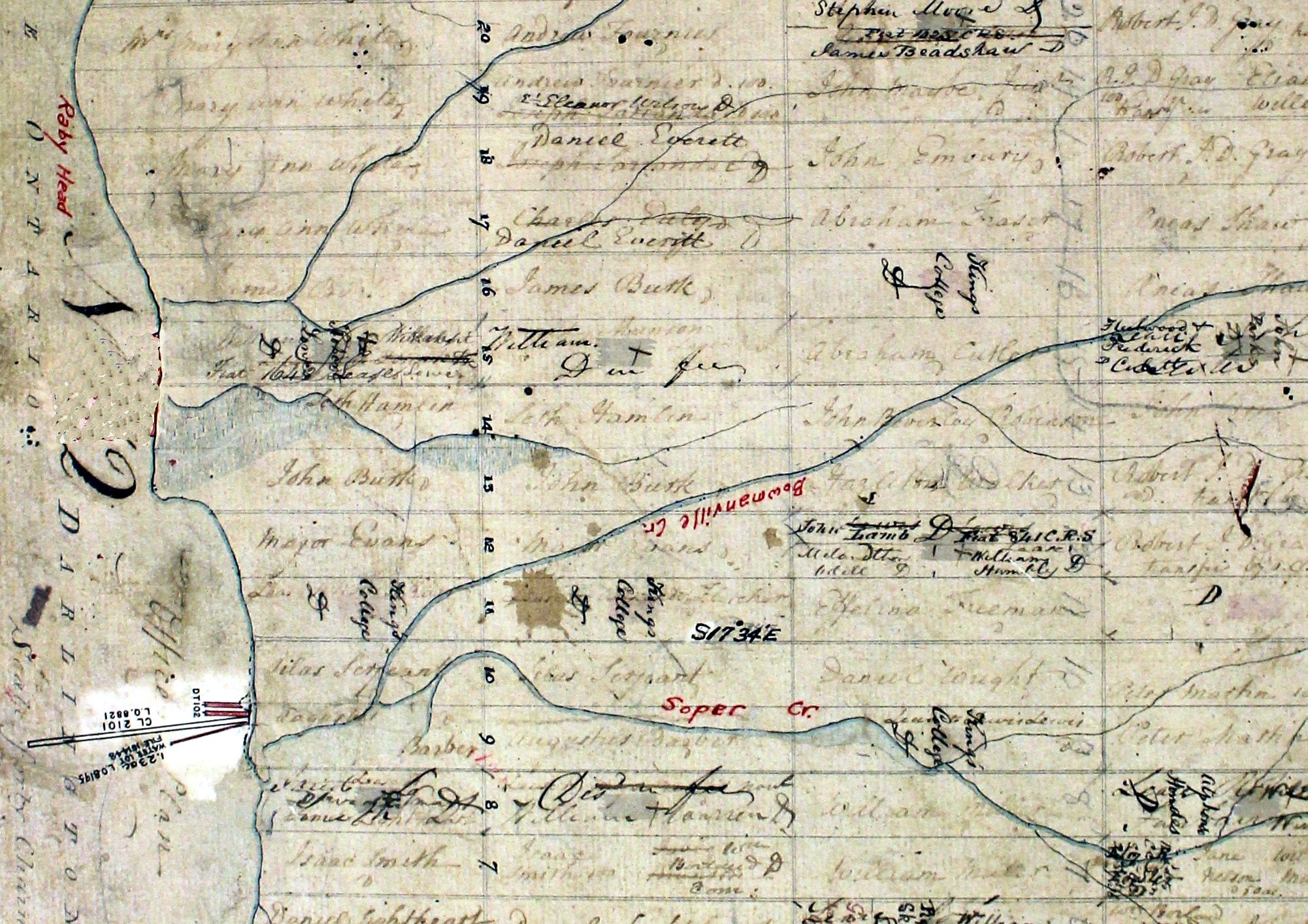The land known as the late Bowman Estate, and which comprises the principal site of the town of Bowmanville, was first drawn from Government by Mr. John Burk, who, after having built a grist and saw mill upon it, sold it to a Mr. Purdy; but after a time, it again came into the possession of Mr. Burk, who sold it to Mr. Lewis, who, in connection with the milling business, opened a store. This was the first store opened in Darlington. Mr. Lewis remained in business for four years; he then sold out to Mr. Charles Bowman. This appears to have been about the year 1824. The Post Office was located at Black's Hill, (the late Youal Homestead, now occupied by A. Scott) Col. James Black, Postmaster. It was opened soon after the war of 1812. The mail was brought from Kingston to York, once a week, on mule-back, or when travelling was good, during winter, in a sleigh. Wm. McMullen was mail carrier. His mule, it is said, on good authority, died about twelve years ago in Markham. A Post Office was established at Darlington Mills, in 1829, the late Mr. Robert Fairbairn, then in charge of the Bowman business, being appointed Postmaster. His house was situated on the east bank of the millpond, where an old orchard may now be see. This orchard he planted soon after his arrival in Darlington. The first mail that came to this place was opened by John Simpson, (the present Hon.) a young man, who was then clerk for Mr. Fairbairn. The mail was carried in an open wagon, with passengers, the passengers usually sitting in the wagon while the mail was changed, it being passed through an open window for that purpose. On one occasion, it is said, the mail came through without ceremony of having the windows opened, taking the glass and some of the sash along with it. I do not know the precise time that this occurred, but the late Mr. Wm. Glover was then mail carrier. The first person who contracted to deliver the mails at Darlington Mills, was a Mr. Odgen, of Clarke. About this time, Mr. Simpson took the census of Darlington, which amounted to 118 persons; only one house was then erected north of the main road.