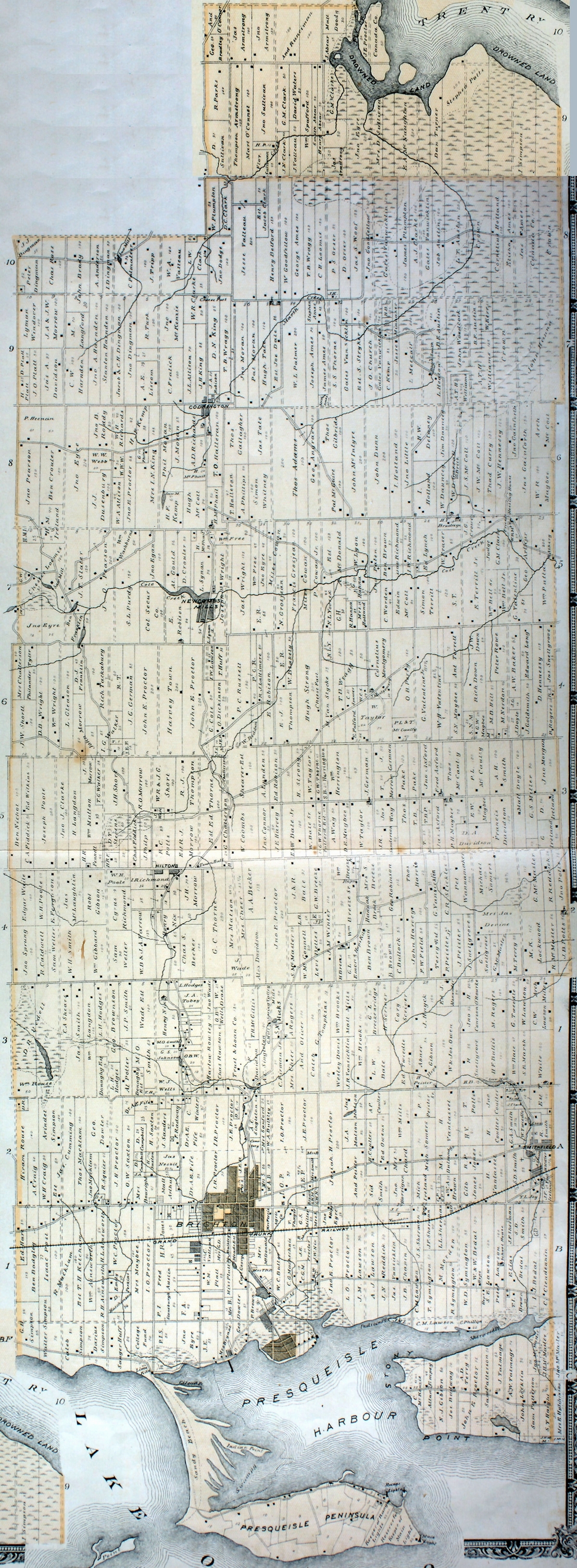 James Carl KEMP, J.P., born in Ameliasburgh in 1802,married in 1822, and brought up a family of eleven children in the township of Cramahe, and is perhaps now the oldest living native of the place. He has a distinct recollection of the early settlers in the old township. They correspond with those already given under the head of Cramahe. The old gentleman's reminiscences are very interesting. John E. PROCTOR, farmer, merchant and mill owner, was born in the place. His father, Isaac, who came in from Vermont, took up land in the old township of Cramahe, many years ago. John LOCKWOOD was the first postmaster. His son T.C. LOCKWOOD, in the office succeeds him. Milton K. LOCKWOOD, another son, is the collector of customs. There is a printing office. The Ensign newspaper was originally established by Peter BEGG, and afterwards by J. B. BENSON, who purchased the plant. Richard SPENCER, son of Hazelton SPENCER, an old grantee of lands in Murray, formerly published the Brighton Flag. Brighton harbour was originally known as Freeman Point and Gosport. The Government sold lots to private parties, who have built wharves. Wharves are owned by J.D. MCKENZIE, Colin MCKENZIE, A. MCCALLUM, and Capt. W. QUICK. The Government expended $30,000 in 1875, in dredging a new channel. The harbour is free. |