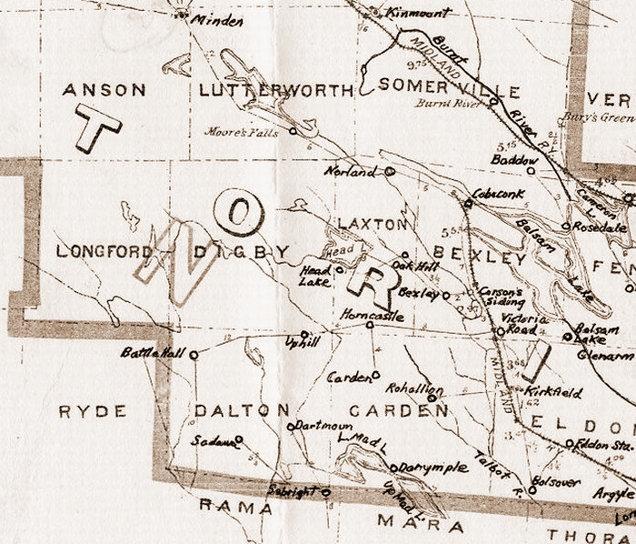 Longford, Digby, and Dalton have a few streams of considerable size, two branches of Black River flowing westward through the two last mentioned townships. Digby also has a branch of Gull River, and Head lake lies on the boundary between it and Laxton, divided from Somerville by Gull River and Mud Turtle Lake. From Deer Lake and Perch Lake, in Laxton, the Talbot River and Perch Creek flow into Bexley, in which township they unite below Raven Lake. Bexley is very irregular in shape by reason of the many deep indentations of Balsam Lake, which , with Gull River, divides it from Somerville. Grand Island, in Balsam Lake, belongs mostly to Bexley. From Bexley the Talbot River flows into and through the southern part of Carden, until it enters Eldon, receiving several branches. In the northwest are Upper and Lower Mud lakes, drained into dalton by Head River, which again enters the northeast corner of Carden, cuts the corner of Laxton, and flows through the southern part of Digby to the lake. Somerville is divided diagonally, from northeast to southwest by Burnt River, of which Union Creek is a branch from the east. Between Gull and Burnt Rivers lies Four Mile Lake, of which the outlet is Cobden Creek, flowing into Balsam Lake.