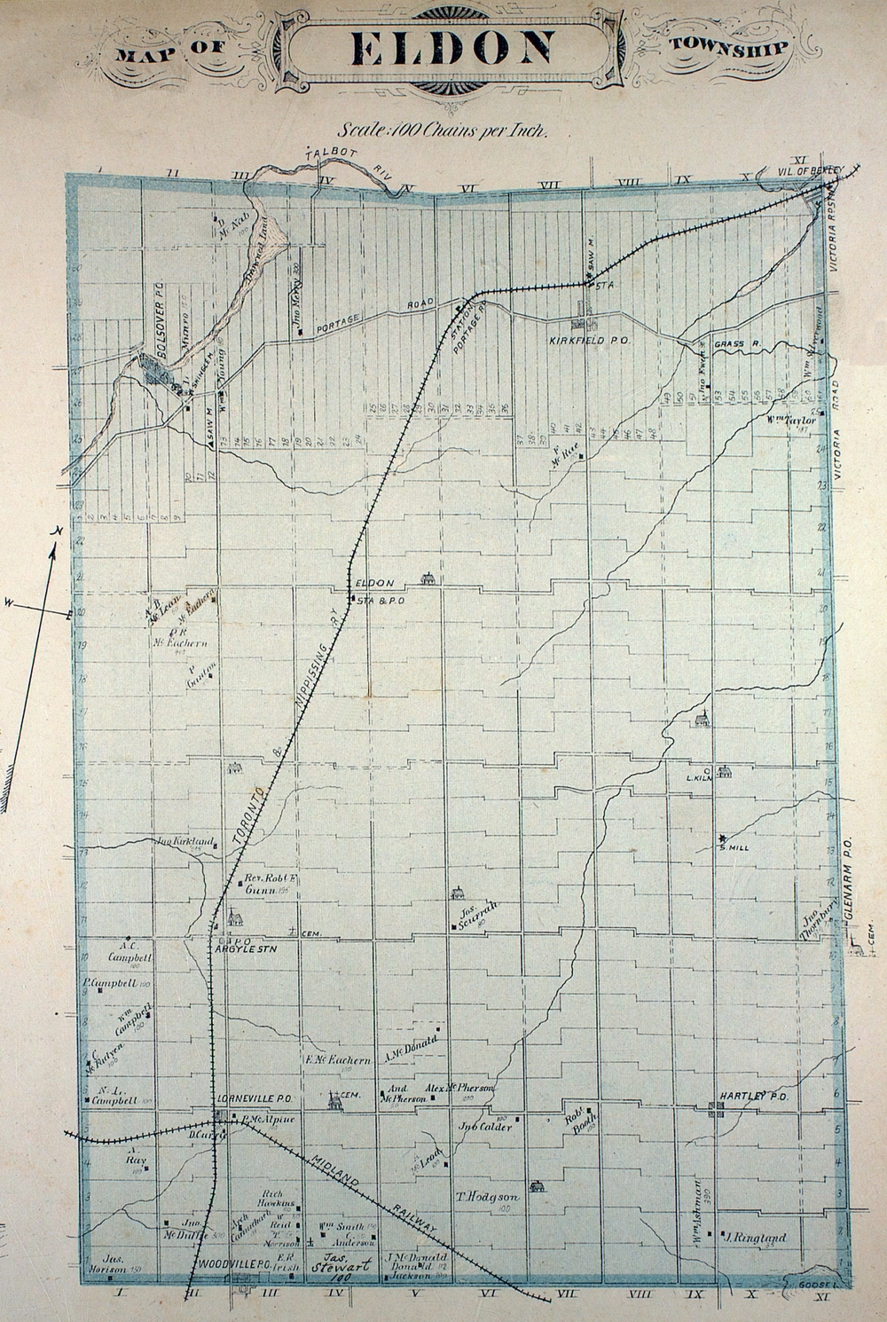 In 1838, Eldon's whole population was only 641; it had increased to 951 in 1842, when the Colborne District was formed. On the organization of municipal institutions in 1850, Israel Ferguson, who had been District Councillor, was elected the first Reeve, which position he held about a dozen years. The other members of the first council were, Archibald McFayden, Jas. McPherson, Wm. McCreadie, and Neil Smith. Angus Ray was appointed Clerk, an office he held till 1866; Donald Smith, Treasurer; Duncan McEachern, Assessor; Jno. McLaughlin, Collector, and Rev. Jno. McMurchy, Superintendent of Schools. The auditors appointed were F.W. Stevenson, by the Reeve, and James McLaughlin, by the Council. The signatures to the declarations of all the officers, including path-masters, fence-viewers, and pound-keepers, do not show a single 'his mark.' The attention of the Council from the first was principally drawn to roads and schools. The earl meetings were itinerant , the favorite place for the first few years being the house of Jas. McPherson; in 1854 the schoolhouse in section No. 1 was used; and in 1855 a chamber was rented for 1 Pound, in the house of Archibald Currie, Lot 5, Con.2. The following year the intinerant system was resumed, and a meeting in September is recorded as being held at Scottsville, now Argyle. The earliest mention of a meeting at 'Woodville', by that name is in April, 1858, from which date the meetings were held there, and at Argyle for a year or more, after which Woodville became the principal rendezvous, though meetings were occasionally held at other points. About this time, the Township of Carden was opened, and in September, 1859, a bylaw was passed forming Eldon and Carden into rural wards. In 1860 the assessment valuation of Eldon was $202,943.60; that of Carden but $17,041. The following year Carden was no longer associated with Eldon, the collections for which were: non-resident, $461.54; resident, $1830.51; trustee rates, $341.11. In this year Victoria became an independent County, bringing a new era to the townships composing it. A few years later the railway from Port Hope to Lindsay, was extended to Beaverton, passing through the south-western part of Eldon. A station was established near Woodville in 1871. During the following year the Toronto and Nippissing, to which Eldon granted $44,000, was built through the township; entering at the south-west, passing northward, and then turning and leaving at the extreme north-east corner; crossing the other railway line at Woodville, and having several stations within the township. Since then the progress of Eldon and the townships to the north has been more rapid than formerly.