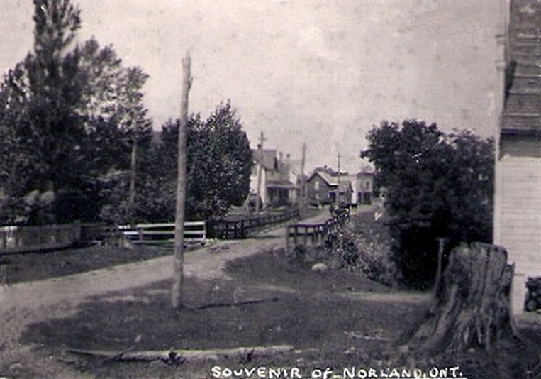 The road skirts their western shores and at intervals discloses magnificent scenery. Every summer and fall tourists in great numbers now visit all those waters, and in the near future North Victoria lakes will stand unrivalled as summer resorts. The country abounds in minerals which in a few years will be developed and add wealth to the district. At Norland all was bustle. Mr. Carl's and Mr. Woodcock's store were doing a rushing business, Mr. Bell’s and Mr. Russell's blacksmith shops were busy, and all other places assumed holiday aspect. Mr. John Bailey, reeve of Laxton, is now erecting a splendid new bridge over Gull River above the mills. It has three piers with two approach piers. The water in the river at that point is twenty feet deep, with rock bottom. Messrs William and Robert Adair, Mr. Peel and others assist Mr. Bailey. Repairing to the Orange hall one of the happiest sights of the day presents itself to view.