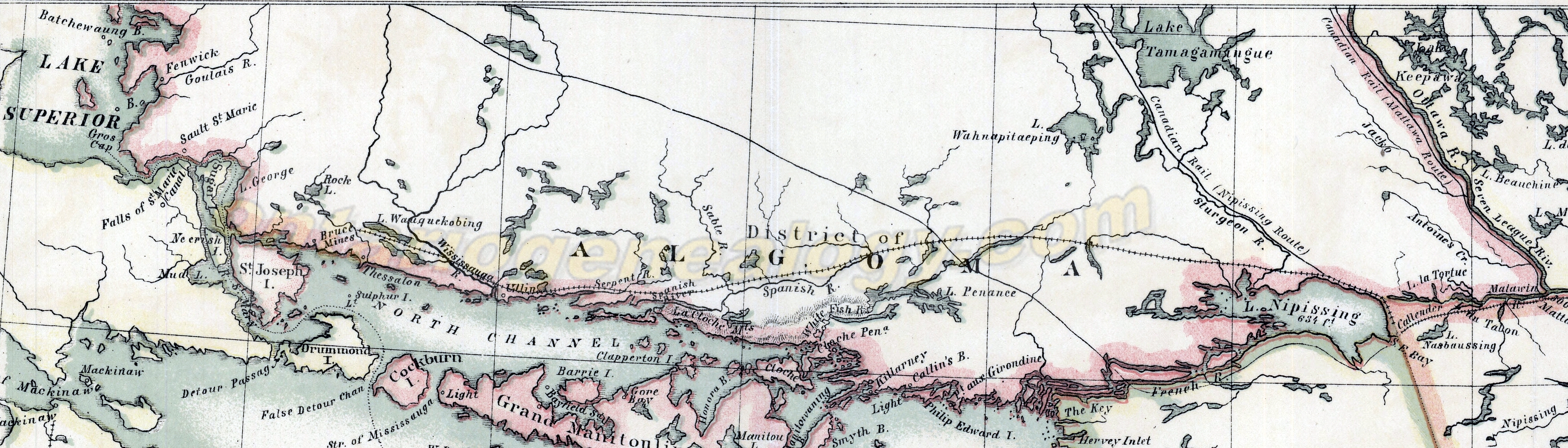 Algoma District Ontario Settlement Map 1899 Nicely detailed map showing towns and villages that were located on the railway lines to the west