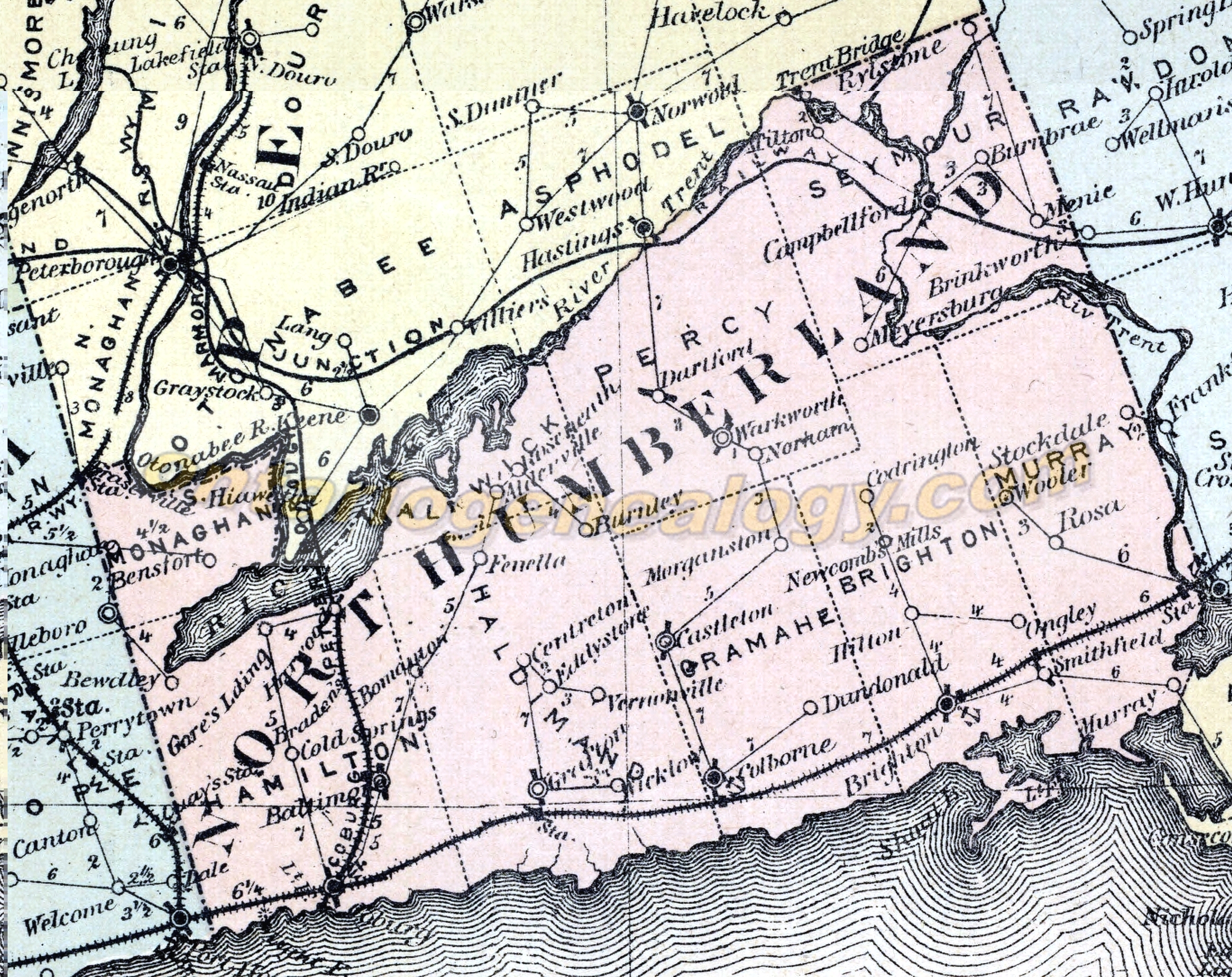 The 1892 Northumberland County directory is an extremely valuable resource for locating the exact location of your ancestors, especially those in the townships, where Concession and Lot number are given. Townships with your pioneer ancestors names and locations recorded include Alnwick, Brighton, Cramahe, Haldimand, Hamilton, Murray, Percy, Seymour and South Monaghan. Examination of these directories often gives valuable clues as to family relationships, where properties are close to each other.